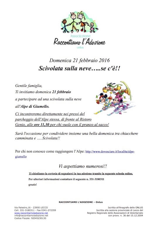 Ti invitiamo domenica 21 febbraio a partecipare ad una scivolata sulla neve all'Alpe di Giumello.