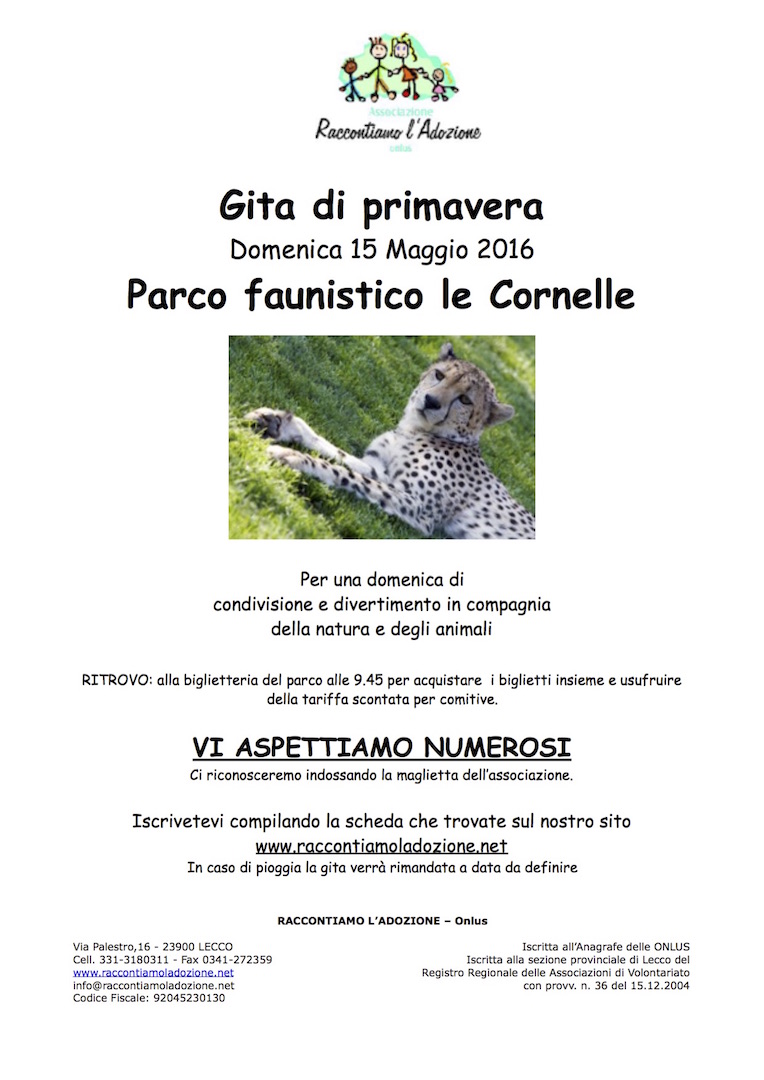 Ti invitiamo alla gita di primavera organizzata dalla nostra associazione. Sarà l'occasione per trascorrere insieme ad altre famiglie una domenica di festa.