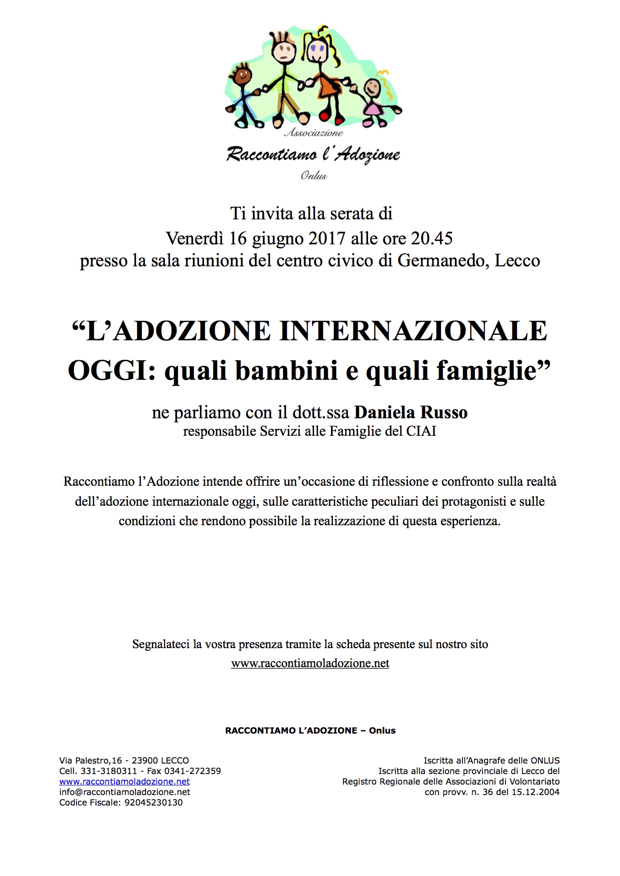 Raccontiamo l’Adozione intende offrire un’occasione di riflessione e confronto sulla realtà dell’adozione internazionale oggi, sulle caratteristiche peculiari dei protagonisti e sulle condizioni che rendono possibile la realizzazione di questa esperienza.
