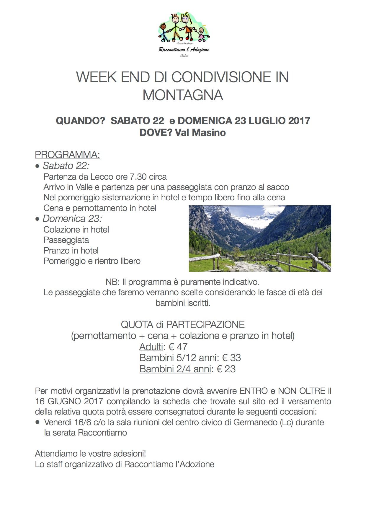 abbiamo pensato anche quest’anno di organizzare un week end di condivisione in montagna, scegliendo la VAL MASINO come meta…nella splendida cornice di questa valle passeggeremo, pranzeremo al sacco, chiacchiereremo e giocheremo tutti insieme!