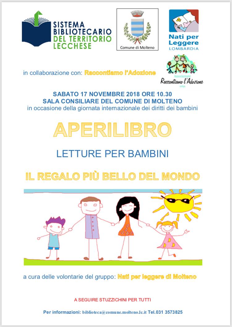 carissime famiglie vi invitiamo all’iniziativa che faremo in collaborazione con Nati per Leggere presso la biblioteca di Molteno , letture per bambini, in occasione della giornata dei diritti del fanciullo”