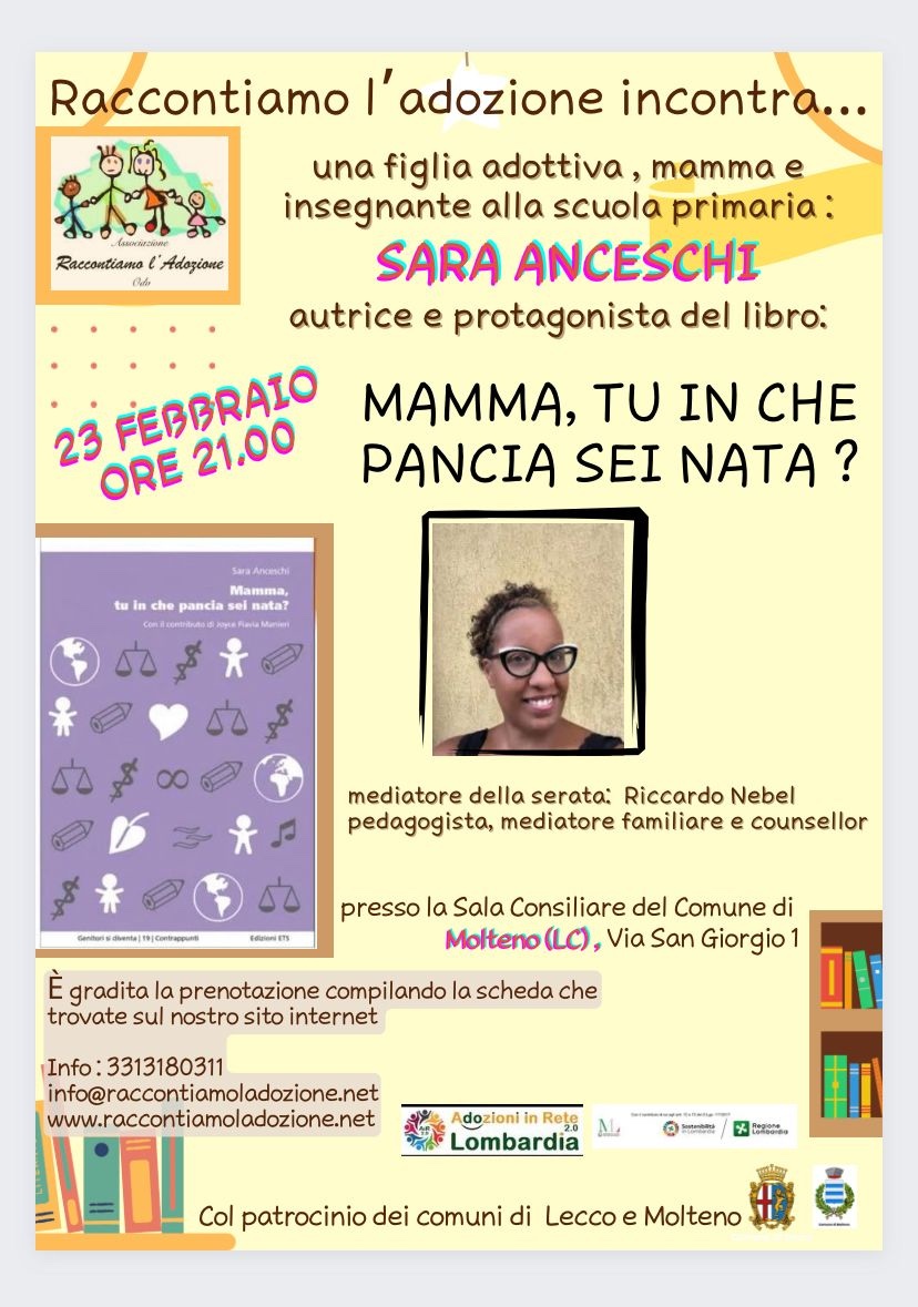Serata con Sara Anceschi. mamma , tu in che pancia sei nata ? Venerdì 23 febbraio 2024 h.21.00 Presso la sala consiliare del comune di Molteno (LC)